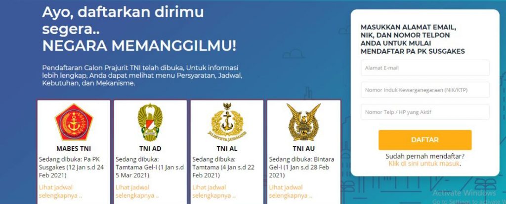 Tamtama TNI AD (maks 5 Maret 2021) : http://ad.rekrutmen-tni.mil.id/registrasi/tamtama-ad