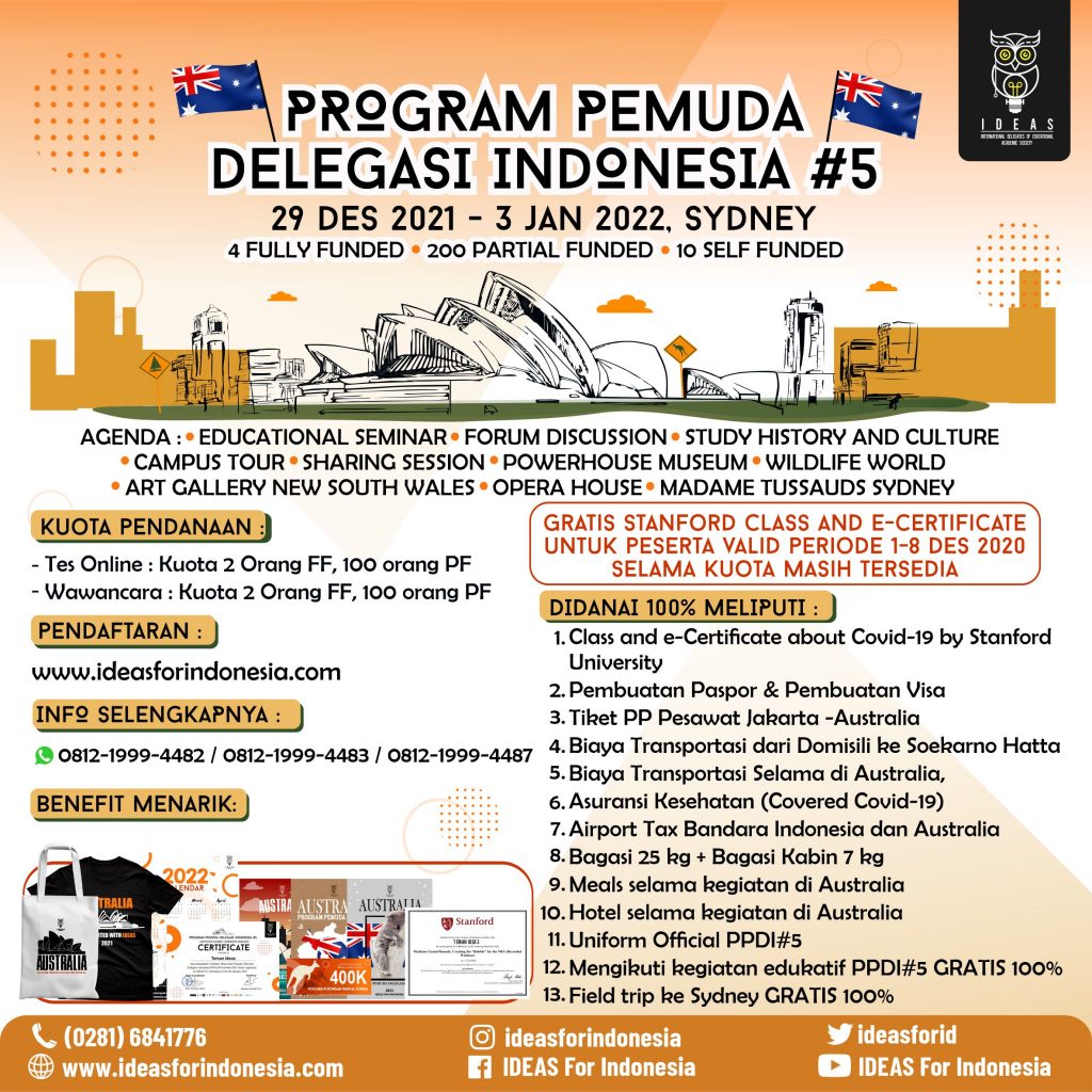 IDEAS For Indonesia mencari kandidat anak muda yang siap berkontribusi dalam PPDI #5 Australia 2021. 4 kandidat terbaik akan didanai 100% dengan misi sebagai berikut: