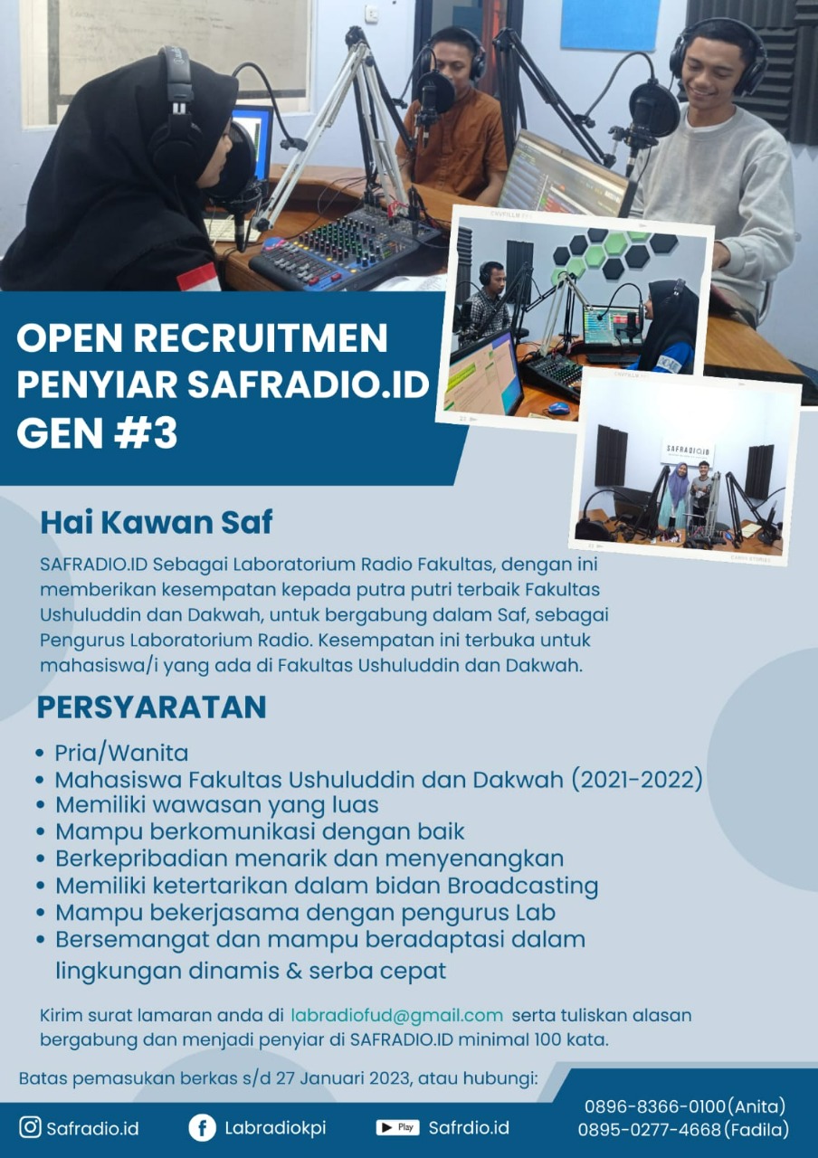 Kali ini, safradio membuka kesempatan untuk mahasiswa/i Fakultas Ushuluddin dan Dakwah angkatan 2021-2022 untuk bergabung dan menjadi bagian dari Safradio Gen 03. Jangan lewatkan kesempatan ini!
